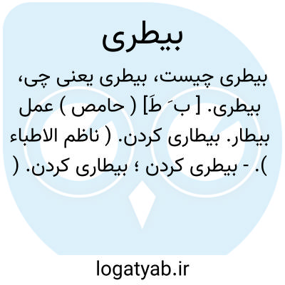 لغت نامه دهخدا بیطری. [ ب َ طَ] ( حامص ) عمل بیطار. بیطاری کردن. ( ناظم الاطباء ).- بیطری کردن؛ بیطاری کردن. ( ناظم الاطباء ).