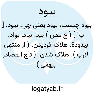 بیود. [ ب ُ ] ( ع مص ) بید. بیاد. بواد. بیدودة. هلاک گردیدن. ( از منتهی الارب ). هلاک شدن. ( تاج المصادر بیهقی ) ( المصادر زوزنی ) ( دهار ) ( از اقرب الموارد ). در لسان العرب چنین آمده است: باد الشی یبید بیداً و بیاداً و بیوداً و بیدودة؛ انقطع و ذهب، و بادَ بیداً؛ اذا هلک. || فرورفتن آفتاب. ( از منتهی الارب ): بادت الشمس بیوداً؛ غربت. ( از اقرب الموارد ) ( از لسان العرب ).