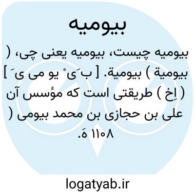 ( بیومیة ) بیومیة. [ ب َی ْ یو می ی َ ] ( اِخ ) طریقتی است که مؤسس آن علی بن حجازی بن محمد بیومی ( 1108 هَ. ق. ) بوده و خود از پیروان طریقه قادریه بوده است و این فرقه در جده و مکه و فرات و سند تکایایی دارد و تکیه اصلی آنان در قریه ای نزدیک شهر قاهره است و ذکر پیروان این طریقت «یا اﷲ» است با فرود آوردن سر و گذاردن دستها بر روی سینه هایشان. ( دائرة المعارف فارسی ).