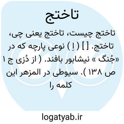 تاختج. [ ] ( اِ ) نوعی پارچه که در «جُنگ » نیشابور بافند. ( از دُزی ج 1 ص 138 ). سیوطی در المزهر این کلمه را از قول ثعالبی جزو کلمات فارسی معرب ذکر کرده است. رجوع به المزهر چ مصر ص 163 شود.