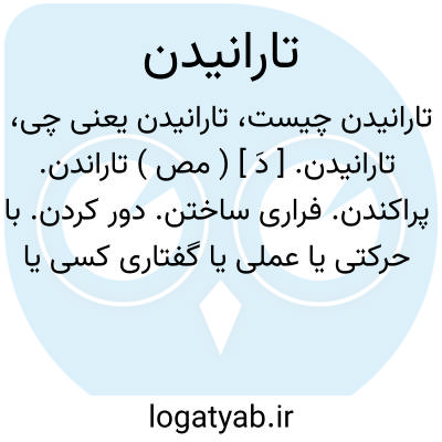 تارانیدن. [ دَ ] ( مص ) تاراندن. پراکندن. فراری ساختن. دور کردن. با حرکتی یا عملی یا گفتاری کسی یا حیوانی را ترساندن و به رفتن واداشتن. چیزی را از هم پاشیدن. رجوع به تاراندن شود.