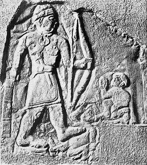 او در نقش برجسته خود با سلاح و زیرپا گذاشتن دشمنان دیده می شود. در کنار نقش برجسته، کتیبه ای به زبان اکدی وجود دارد که به حفاظت از ایزدان شمش و آداد اشاره می کند.