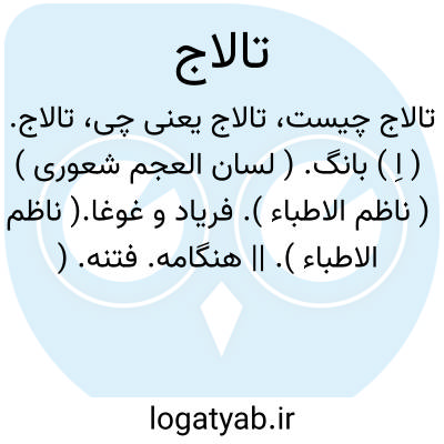 تالاج. ( اِ ) بانگ. ( لسان العجم شعوری ) ( ناظم الاطباء ). فریاد و غوغا.( ناظم الاطباء ). || هنگامه. فتنه. ( ناظم الاطباء ). و رجوع به لسان العجم شعوری ج 1 ص 274 شود.