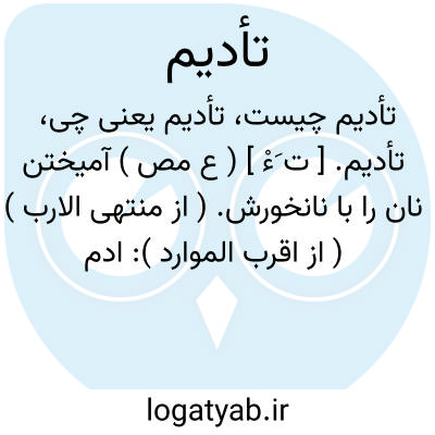 تأدیم. [ ت َءْ ] ( ع مص ) آمیختن نان را با نانخورش. ( از منتهی الارب ) ( از اقرب الموارد ): ادم الخبز؛ بسیار آمیخت نان را با نان خورش. ( منتهی الارب ) ( ناظم الاطباء ).
