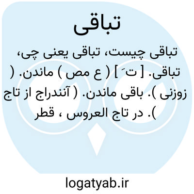 تباقی. [ ت َ ] ( ع مص ) ماندن. ( زوزنی ). باقی ماندن. ( آنندراج از تاج ). در تاج العروس، قطر المحیط، اقرب الموارد، منتهی الارب این مصدر دیده نشد.