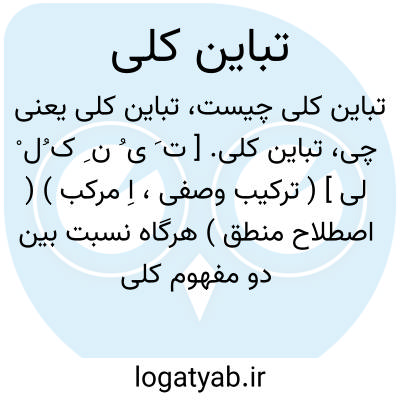 تباین کلی. [ ت َ ی ُ ن ِ ک ُل ْ لی ] ( ترکیب وصفی، اِ مرکب ) ( اصطلاح منطق ) هرگاه نسبت بین دو مفهوم کلی چنان باشد که مفهوم یکی بر هیچ یک از مصادیق دیگری منطبق نگردد، آن نسبت را تباین کلی نامند مانند مفهوم انسان و سگ ومرجع تباین کلی به دو قضیه سالبه کلیه است. ( از تعریفات جرجانی ) ( از کشاف اصطلاحات الفنون ج 1 ص 173 ).