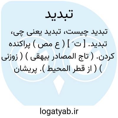 تبدید. [ ت َ ] ( ع مص ) پراکنده کردن. ( تاج المصادر بیهقی ) ( زوزنی ) ( از قطر المحیط ). پریشان کردن چیزی را. ( از منتهی الارب ) ( از آنندراج ) ( از ناظم الاطباء ). || درمانده گردیدن. || نشسته به نیم خواب رفتن. ( از قطر المحیط ) ( از منتهی الارب ) ( از آنندراج ) ( ناظم الاطباء ).