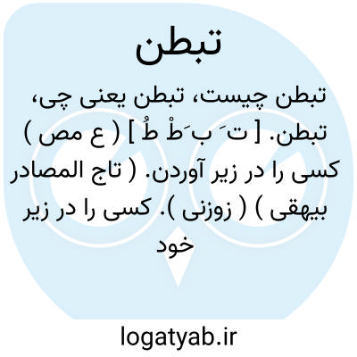 تبطن. [ ت َ ب َطْ طُ ] ( ع مص ) کسی را در زیر آوردن. ( تاج المصادر بیهقی ) ( زوزنی ). کسی را در زیر خود گرفتن. ( منتهی الارب ) ( آنندراج )( ناظم الاطباء ). || تبطن؛ نزدیکی کردن با جاریه، و لمس کردن او و مالیدن شکم خود را بشکم وی. ( از قطر المحیط ): تبطنت الجاریة؛ انداختم خود را بر روی آن کنیزک. ( ناظم الاطباء ). || گردیدن در چراگاه. ( تاج المصادر بیهقی ). در چراگاه گردیدن. ( از منتهی الارب ) ( آنندراج ) ( ناظم الاطباء ): تبطن الکلأً؛ گردید در چراگاه. ( از اقرب الموارد ) ( از قطر المحیط ) ( منتهی الارب ). || دانستن حقیقت کاری. ( منتهی الارب ) ( آنندراج ) ( ناظم الاطباء ). || تبطن در وادیه؛ داخل شدن در آن. ( از قطر المحیط ).