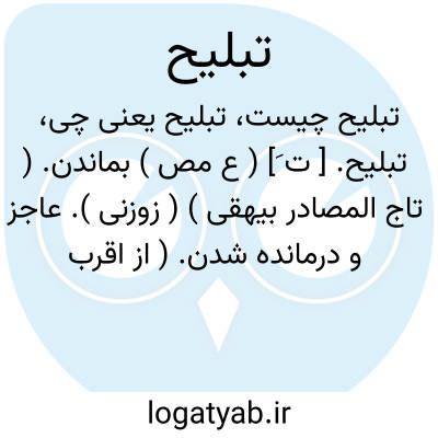 تبلیح. [ ت َ] ( ع مص ) بماندن. ( تاج المصادر بیهقی ) ( زوزنی ). عاجز و درمانده شدن. ( از اقرب الموارد ) ( از قطر المحیط ). درمانده و مانده گردیدن. ( منتهی الارب ) ( ناظم الاطباء ). مانده شدن. ( آنندراج ): استنفرتهم فبلحوا علی؛ ای اَبوا کأنهم اعیوا عن الخروج معه و اعانته و طلبت ُ منه ُ حقی فبلح؛ اَی عجز عن الاداء. ( اقرب الموارد ).