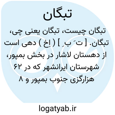 تبگان. [ ت َ ب ِ ] ( اِخ ) دهی است از دهستان لاشار در بخش بمپور، شهرستان ایرانشهر که در 62 هزارگزی جنوب بمپور و 8 هزارگزی خاور شوسه بمپور به چابهار قرار دارد. کوهستانی و گرمسیر و مالاریایی است و 50 تن سکنه دارد. آب آن از قنات و محصول آن غلات و خرما و شغل اهالی زراعت است و راه مالرو دارد. ( فرهنگ جغرافیایی ایران ج 8 ).