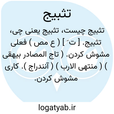 تثبیج. [ ت َ ] ( ع مص ) فعلی مشوش کردن. ( تاج المصادر بیهقی ) ( منتهی الارب ) ( آنندراج ). کاری مشوش کردن. ( ناظم الاطباء ). مشوش کردن فعلی. ( زوزنی ). || تعمیه نمودن درسخن و خط، و بیان ناکردن آن. ( زوزنی ) ( منتهی الارب ) ( آنندراج ) ( ناظم الاطباء ). گذاشتن شبان عصا را بر پشت و هر دو دست را بدان بند کردن و آویختن. ( منتهی الارب ) ( آنندراج ) ( ناظم الاطباء ). رجوع به تَثَبﱡج شود.