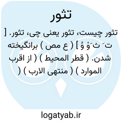 تثور. [ ت َ ث َوْ وُ ] ( ع مص ) برانگیخته شدن. ( قطر المحیط ) ( از اقرب الموارد ) ( منتهی الارب ) ( آنندراج ) ( ناظم الاطباء ): ثارت بینهم الفتنة. ( اقرب الموارد ). || برخاستن و برآمدن گرد و دود. ( از اقرب الموارد ) ( از قطر المحیط ) ( منتهی الارب ) ( آنندراج ) ( ناظم الاطباء ). || برجستن سنگخوار و ملخ. ( از قطر المحیط ) ( از منتهی الارب ) ( ازآنندراج ) ( از ناظم الاطباء ). || بهم برآمدن نفس از ترس یا اندوه. ( از قطر المحیط ) ( از اقرب الموارد ). بهیجان آمدن دل. || برآمدن آب و روان گردیدن آن. ( منتهی الارب ). || جهیدن برکسی. جهیدن بر کسی و حمله آوردن بر او. ( از اقرب الموارد ) ( از قطر المحیط ). || ظاهر شدن خون.( از قطر المحیط ) ( از منتهی الارب ) ( از ناظم الاطباء ). || برآمدن حصبه بر اندام. ( منتهی الارب ) ( اقرب الموارد ). برآمدن تبخاله از دهن تب دار. ( از اقرب الموارد ). بهمه معانی رجوع به ثوران و ثور شود.