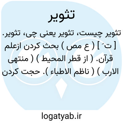 تثویر. [ ت َ ] ( ع مص ) بحث کردن ازعلم قرآن. ( از قطر المحیط ) ( منتهی الارب ) ( ناظم الاطباء ). حجت کردن از علم و احکام قرآن. ( آنندراج ): تثویر کتاب؛ بحث کردن در معانی آن و منه: من ارادالعلم فلیثور القرآن. ( اقرب الموارد ). || برانگیختن کسی یا چیزی را. ( از اقرب الموارد ) ( از قطر المحیط ) ( از منتهی الارب ) ( ناظم الاطباء ). برانگیختن گرد. برانگیختن فتنه و جنگ. ( تاج المصادر بیهقی ) ( زوزنی ) ( آنندراج ). شورانیدن. ( تاج المصادر بیهقی ) ( زوزنی ).
