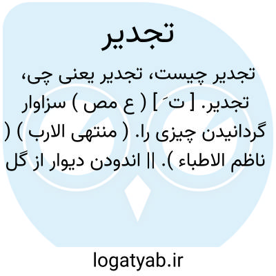 لغت نامه دهخدا تجدیر. [ ت َ ] ( ع مص ) سزاوار گردانیدن چیزی را. ( منتهی الارب ) ( ناظم الاطباء ). || اندودن دیوار از گل و گچ و مانند آن. ( اقرب الموارد ) ( از قطر المحیط ) ( منتهی الارب ) ( ناظم الاطباء ). || آبله نشان شدن. ( تاج المصادر بیهقی ). چیچک برآوردن. ( منتهی الارب ) ( آنندراج ) ( ناظم الاطباء ). || برآمدن برِ درخت برابر نخود. ( منتهی الارب ). برآمدن بارآن درخت باندازه نخود. ( ناظم الاطباء ). || نمودار شدن سرهای گیاه مانند جدری. ( منتهی الارب ). نمودار شدن سرهای گیاه مانند چیچک. ( ناظم الاطباء ).