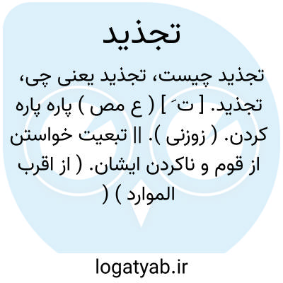 لغت نامه دهخدا تجذید. [ ت َ ] ( ع مص ) پاره پاره کردن. ( زوزنی ). || تبعیت خواستن از قوم و ناکردن ایشان. ( از اقرب الموارد ) ( از قطر المحیط ) ( منتهی الارب ) ( آنندراج ) ( ناظم الاطباء ).