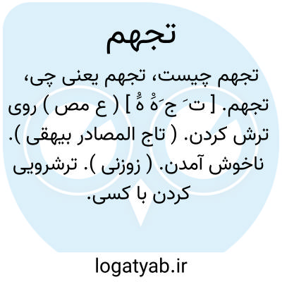 تجهم. [ ت َ ج َهَْ هَُ ] ( ع مص ) روی ترش کردن. ( تاج المصادر بیهقی ). ناخوش آمدن. ( زوزنی ). ترشرویی کردن با کسی. ( منتهی الارب )( ناظم الاطباء ). ناخوش کردن و ترشرویی کردن با کسی. ( آنندراج ): تجهمه ُ و تجهم له ُ؛ استقبله ُ بوجه کریه. ( قطر المحیط ) ( اقرب الموارد ): الدهر یتجهم الکرام. || به آرزوی خود نرسیدن. ( اقرب الموارد ).