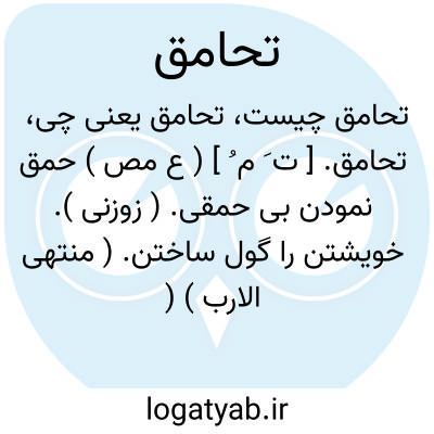 لغت نامه دهخدا تحامق. [ ت َ م ُ ] ( ع مص ) حمق نمودن بی حمقی. ( زوزنی ). خویشتن را گول ساختن. ( منتهی الارب ) ( آنندراج ) ( ناظم الاطباء ) ( از اقرب الموارد ) ( از قطر المحیط ).