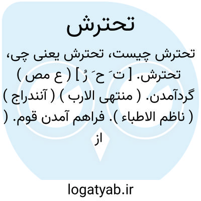 تحترش. [ ت َ ح َ رُ ] ( ع مص ) گردآمدن. ( منتهی الارب ) ( آنندراج ) ( ناظم الاطباء ). فراهم آمدن قوم. ( از اقرب الموارد ) ( از قطر المحیط ). || تحترشوا علیه فلم یدرکوه؛ شتافتند بر وی تا بگیر آورند او را. ( منتهی الارب ) ( ناظم الاطباء ) ( از اقرب الموارد ).
