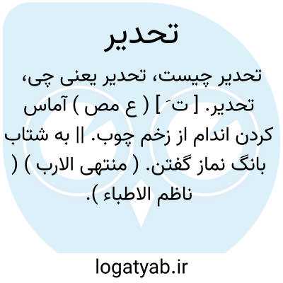 تحدیر. [ ت َ ] ( ع مص ) آماس کردن اندام از زخم چوب. || به شتاب بانگ نماز گفتن. ( منتهی الارب ) ( ناظم الاطباء ). به شتاب قرائت کردن. ( قطر المحیط ). || به شتاب راه رفتن. ( قطر المحیط ).