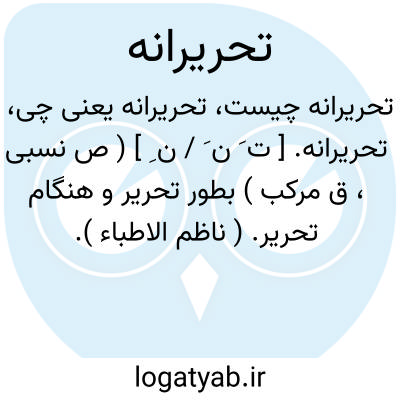 لغت نامه دهخدا تحریرانه. [ ت َ ن َ / ن ِ ] ( ص نسبی، ق مرکب ) بطور تحریر و هنگام تحریر. ( ناظم الاطباء ).