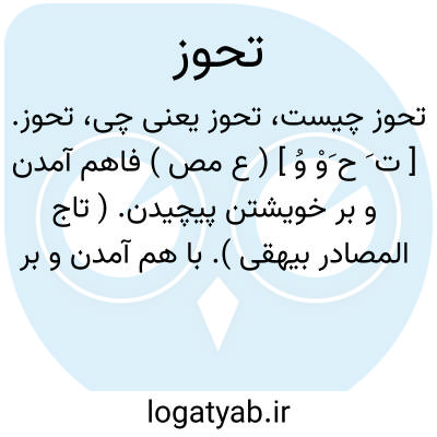تحوز. [ ت َ ح َوْ وُ ] ( ع مص ) فاهم آمدن و بر خویشتن پیچیدن. ( تاج المصادر بیهقی ). با هم آمدن و بر خویشتن پیچیدن. ( زوزنی ). بر خویشتن پیچیدن.( منتهی الارب ) ( ناظم الاطباء ) ( آنندراج ). بر خود پیچیدن مار. ( قطر المحیط ) ( اقرب الموارد ). و برخی آنرا مطلق گرفته اند و مخصوص مار ندانسته اند. ( اقرب الموارد ). || از آن سوی که باشی بر دیگر سوی گردیدن در جنگ. ( تاج المصادر بیهقی ) ( زوزنی ). یک سو رفتن و گوشه گرفتن. ( منتهی الارب ) ( آنندراج ) ( ناظم الاطباء ). تنحی مرد. ( اقرب الموارد ) ( قطر المحیط ): دخل علیه فماتحوز له عن فراشه؛ ای ماتنحی. ( اقرب الموارد ).