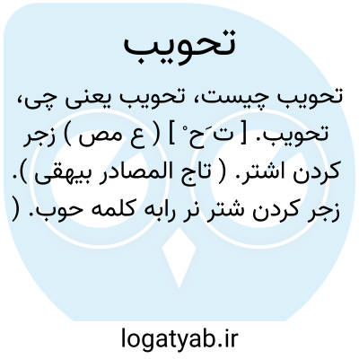 تحویب. [ ت َح ْ ] ( ع مص ) زجر کردن اشتر. ( تاج المصادر بیهقی ). زجر کردن شتر نر رابه کلمه حوب. ( منتهی الارب ) ( آنندراج ). زجر کردن جمل و حَوب گفتن آنرا. ( اقرب الموارد ) ( قطر المحیط ).