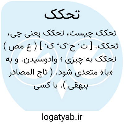 تحکک. [ ت َ ح َک ْ ک ُ ] ( ع مص ) تحکک به چیزی؛ وادوسیدن. و به «با» متعدی شود. ( تاج المصادر بیهقی ). با کسی واکاویدن. ( زوزنی ). کاویدن. تمرس. ( منتهی الارب ). کاویدن. ( ناظم الاطباء ). || پیش آمدن کسی را به بدی. ( منتهی الارب ) ( ناظم الاطباء ). تعرض به شر. ( اقرب الموارد ) ( قطر المحیط ): فلان ٌ یتحکک بک؛ ای یتحرش بک و یتعرض لشرک. ( اقرب الموارد ). || تحکک عقرب به افعی؛ مثلی است درباره کسی که با قوی تر از خود ستیزه کند. ( از اقرب الموارد ).