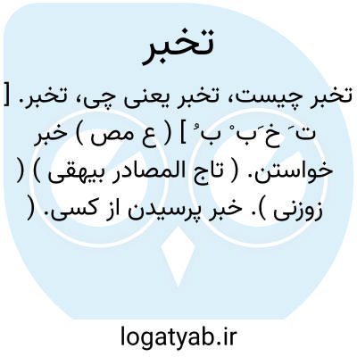 تخبر. [ ت َ خ َب ْ ب ُ ] ( ع مص ) خبر خواستن. ( تاج المصادر بیهقی ) ( زوزنی ). خبر پرسیدن از کسی. ( منتهی الارب ) ( ناظم الاطباء ) ( از اقرب الموارد ) ( از قطر المحیط ). || گوسپندی را بشراکت خریدن و ذبح کردن. ( منتهی الارب ) ( ناظم الاطباء ). خریدن قوم گوسپندی را و سپس ذبح کردن و تقسیم کردن گوشت آن. ( از اقرب الموارد ) ( از قطر المحیط ). || آگاهی به چیزی و باخبر شدن. ( منتهی الارب ) ( ناظم الاطباء ). دانستن حقیقت امری. ( از اقرب الموارد ). دانستن کنه و حقیقت امری. ( از قطر المحیط ).