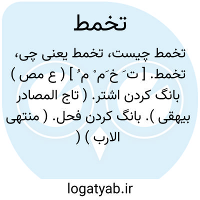 تخمط. [ ت َ خ َم ْ م ُ ] ( ع مص ) بانگ کردن اشتر. ( تاج المصادر بیهقی ). بانگ کردن فحل. ( منتهی الارب ) ( آنندراج ) ( ناظم الاطباء ) ( اقرب الموارد ) ( المنجد ). || آشوب کردن دریا. ( تاج المصادر بیهقی ). موج زدن دریا. ( منتهی الارب ) ( آنندراج ) ( ناظم الاطباء ) ( اقرب الموارد ) ( المنجد ). || تکبرکردن. ( منتهی الارب ) ( ناظم الاطباء ) ( اقرب الموارد ) ( المنجد ). گردن کشی کردن. ( آنندراج ). || خشم گرفتن. ( منتهی الارب ) ( ناظم الاطباء ). غضب کردن. ( اقرب الموارد ) ( المنجد ) ( آنندراج ). || تخمط دندانهای نیش بعیر؛ ظاهر شدن و بلند گردیدن آنها. اوس گوید: تخمط فینا ناب ُ آخر مقرِم. ( اقرب الموارد ).
