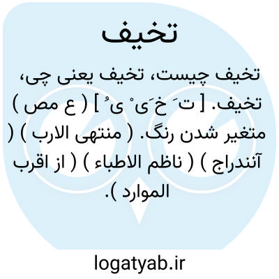 لغت نامه دهخدا تخیف. [ ت َ خ َی ْ ی ُ ] ( ع مص ) متغیر شدن رنگ. ( منتهی الارب ) ( آنندراج ) ( ناظم الاطباء ) ( از اقرب الموارد ). تغیر و تنوع رنگ چیزی. ( المنجد ).