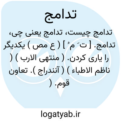 تدامج. [ ت َ م ُ ] ( ع مص ) یکدیگر را یاری کردن. ( منتهی الارب ) ( ناظم الاطباء ) ( آنندراج ). تعاون قوم. ( اقرب الموارد ) ( المنجد ). || تدامج قوم بر فلان؛تألب آنان. ( اقرب الموارد ). || تدامج برچیزی؛ اجتماع بر آن. ( اقرب الموارد ) ( از المنجد ).