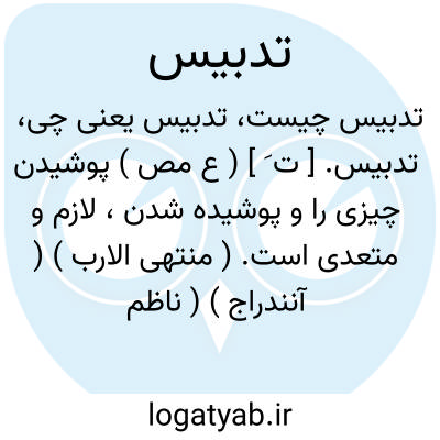 تدبیس. [ ت َ ] ( ع مص ) پوشیدن چیزی را و پوشیده شدن، لازم و متعدی است. ( منتهی الارب ) ( آنندراج ) ( ناظم الاطباء ) ( از اقرب الموارد ). مخفی شدن و مخفی کردن. ( از المنجد ). || موزه خود را زدن بر چیزی تا آواز برآید از آن. ( منتهی الارب ) ( آنندراج ) ( ناظم الاطباء ) ( از اقرب الموارد ). || شدت یافتن شیرینی انگور چنانکه همانند عسل گردد. || دِبس. شیره شدن عصیر جوشیده. || شیره ساختن مرد عصیر را. ( از المنجد ).