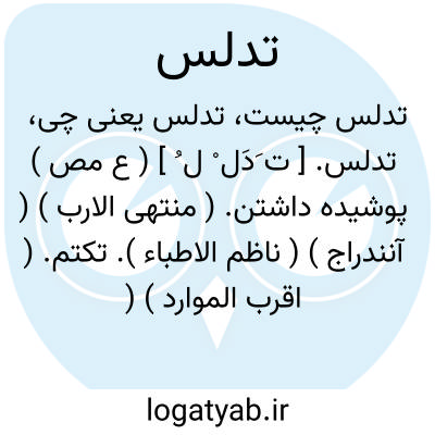 تدلس. [ ت َدَل ْ ل ُ ] ( ع مص ) پوشیده داشتن. ( منتهی الارب ) ( آنندراج ) ( ناظم الاطباء ). تکتم. ( اقرب الموارد ) ( المنجد ).اختفاء. ( المنجد ). || اندک اندک گرفتن طعام. || لیسیدن شتران بزبان، اندک چیز را درچراگاه. ( منتهی الارب ) ( آنندراج ) ( ناظم الاطباء ) ( اقرب الموارد ) ( المنجد ). || در تاریکی فرودآمدن قوم. ( منتهی الارب ) ( از آنندراج ) ( ناظم الاطباء ).