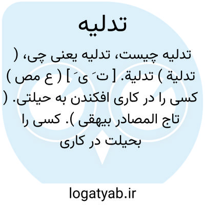 ( تدلیة ) تدلیة. [ ت َ ی َ ] ( ع مص ) کسی را در کاری افکندن به حیلتی. ( تاج المصادر بیهقی ). کسی را بحیلت در کاری افکندن. ( ترجمان جرجانی ترتیب عادل بن علی ). انداختن یا نزدیک کردن کسی را بغرور. ( منتهی الارب ) ( ناظم الاطباء ) ( اقرب الموارد ) ( المنجد ): فدلیهما بغرور. ( قرآن 22/7 )؛ یعنی نزدیک ساخت آنان را بنافرمانی، یانزدیک ساخت آنان را از بهشت بزمین یا جرأت داد آنان را بر خوردن. از دل، و دالّة، یعنی جرأت. ( از منتهی الارب ). || چیزی بجای فروگذاشتن. ( تاج المصادر بیهقی ) ( ترجمان جرجانی ترتیب عادل بن علی ).