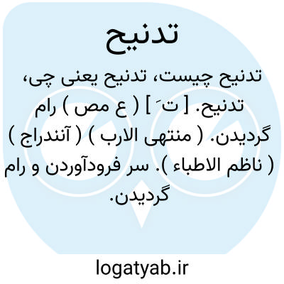لغت نامه دهخدا تدنیح. [ ت َ ] ( ع مص ) رام گردیدن. ( منتهی الارب ) ( آنندراج ) ( ناظم الاطباء ). سر فرودآوردن و رام گردیدن. ( از المنجد ) ( از اقرب الموارد ).