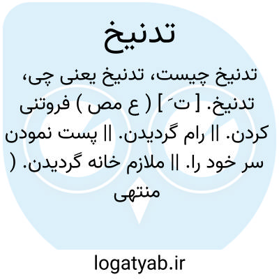 تدنیخ. [ ت َ ] ( ع مص ) فروتنی کردن. || رام گردیدن. || پست نمودن سر خود را. || ملازم خانه گردیدن. ( منتهی الارب ) ( از آنندراج ) ( ناظم الاطباء ) ( اقرب الموارد ) ( المنجد ). || نشیب و فراز پذیرفتن خربزه. ( منتهی الارب ) ( آنندراج ) ( ناظم الاطباء ). دَنَّخَت البطیخة؛ انهزم بعضها و خرج بعضها، کقوله و ان رآنی الشعراء دنخوا. ( اقرب الموارد ). || مشرف شدن قَمَحْدوه کسی بر بلندی پس هر دو گوش و درآمدن پس هر دو گوش. ( ناظم الاطباء ) ( از اقرب الموارد ). بلند گردیدن قَمَحْدوه کسی بلندی پس هر دو گوش را و درآمدن پس بلندی پس هر دو گوش. ( منتهی الارب ).