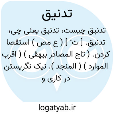 تدنیق. [ ت َ ] ( ع مص ) استقصا کردن. ( تاج المصادر بیهقی ) ( اقرب الموارد ) ( المنجد ). نیک نگریستن در کاری و استقصا کردن. ( منتهی الارب ) ( آنندراج ) ( ناظم الاطباء ). قال الحسن: لاتدنقوا فیدنق علیکم. ( اقرب الموارد ). || بدانگ شماره کردن. ( زوزنی نسخه خطی کتابخانه سازمان ص 26 ). || نزدیک گشتن. ( تاج المصادر بیهقی ). نزدیک شدن خورشید به فروشدن. ( زوزنی ). نزدیک شدن آفتاب به فروشدن. ( منتهی الارب ). نزدیک شدن آفتاب بغروب. ( آنندراج ) ( اقرب الموارد ) ( المنجد ). || نزدیک شدن بمرگ. ( المنجد ) ( اقرب الموارد ). فی الحدیث لا بأس للأسیر اذ خاف به ان یدنق للموت؛ ای یظهر الاشفاء علی الموت فراراًمن ان یمثل به. ( اقرب الموارد ). || چشم بگود فروشدن. ( تاج المصادر بیهقی ). فروشدن چشم بمغاک و سست نگریستن. ( منتهی الارب ) ( آنندراج ) ( ناظم الاطباء ). بمغاک فروشدن چشم. ( اقرب الموارد ) ( المنجد ). || پیوسته سوی چیزی نگریستن. ( تاج المصادر بیهقی ). همواره نگریستن در چیزی. ( منتهی الارب ) ( ناظم الاطباء ) ( اقرب الموارد ) ( المنجد ). || ظاهر شدن در وجه کسی لاغری از رنج یا مرض. ( منتهی الارب ) ( آنندراج ) ( ناظم الاطباء ) ( المنجد ) ( از اقرب الموارد ).