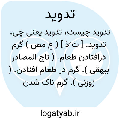 تدوید. [ ت َدْ ] ( ع مص ) گرم درافتادن طعام. ( تاج المصادر بیهقی ). گرم در طعام افتادن. ( زوزنی ). گرم ناک شدن طعام. ( منتهی الارب ) ( آنندراج ) ( ناظم الاطباء ) ( اقرب الموارد ) ( المنجد ). || بر بانوج نشستن و بر هوا آمد و رفت نمودن غلام. ( منتهی الارب ) ( از ناظم الاطباء ) ( ذیل اقرب الموارد ).