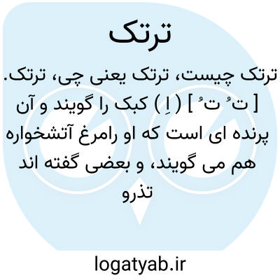 ترتک. [ ت ُ ت ُ ] ( اِ ) کبک را گویند و آن پرنده ای است که او رامرغ آتشخواره هم می گویند، و بعضی گفته اند تذرو است که خروس صحرایی باشد، و به این معنی بجای حرف ثانی زای نقطه دار نیز آمده است. ( برهان ). کبک را نامند، و آنرا مرغ آتشخواره نیز خوانند. ( فرهنگ جهانگیری ). کبک، و صحیح ترنگ است که مخفف تورنگ است. ( فرهنگ رشیدی ). جانوری است خوب رفتار آتشخوار و اندک پرد. در کوههای نواحی هند بود، و آنرا ترنگ و تورنگ و تذرو و چورچور و چور و کبک نیز گویند. ( شرفنامه منیری ). تذرو و قرقاول و کبک. ( ناظم الاطباء ). رجوع به ترنگ شود.