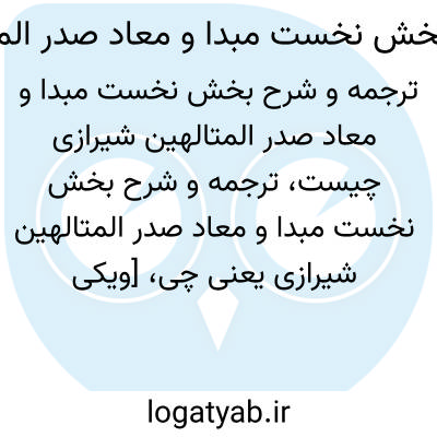 [ویکی نور] ترجمه و شرح بخش نخست مبدا و معاد صدر المتالهین شیرازی (المبدا و المعاد). ترجمه و شرح بخش نخست مبدأ و معاد صدرالمتألهین شیرازی، ترجمه ی آزاد و شرح قسمت «مبدأ» از کتاب «مبدأ و معاد» صدرالمتألهین است که به خامه محقق و مترجم ارجمند، جناب آقای دکتر محمد ذبیحی به انجام رسیده است.