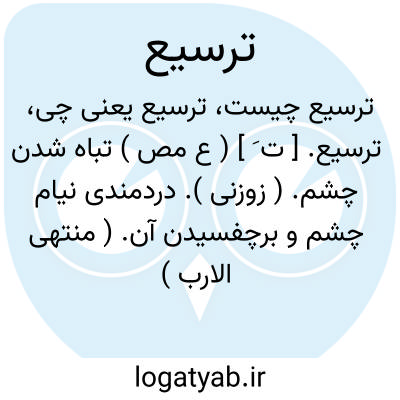 ترسیع. [ ت َ ] ( ع مص ) تباه شدن چشم. ( زوزنی ). دردمندی نیام چشم و برچفسیدن آن. ( منتهی الارب ) ( آنندراج ) ( ناظم الاطباء ). تباه شدن کنج چشم. ( از اقرب الموارد ). بهم چسبیدن پلکهای چشم. ( از المنجد ). || دوال را شکافته و در آن دوال دیگر داخل کردن جهت بندش چیزی، چنانکه در مصاحف میباشد. ( منتهی الارب ) ( آنندراج ) ( ناظم الاطباء ) ( از اقرب الموارد ) ( از المنجد ). || اقامت کردن مرد در منزل و خارج نشدن از آن. ( از اقرب الموارد ) ( از المنجد ). || مهره بستن به پا یا دست کودک جهت دفع چشم. || فاسد شدن اندام و استرخاء آن. ( از المنجد ).