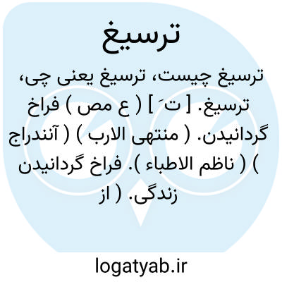 ترسیغ. [ ت َ ] ( ع مص ) فراخ گردانیدن. ( منتهی الارب ) ( آنندراج ) ( ناظم الاطباء ). فراخ گردانیدن زندگی. ( از المنجد ) ( از اقرب الموارد ). || دو سخن را بهم آوردن. ( منتهی الارب ) ( از آنندراج ) ( ناظم الاطباء ). تلفیق بین کلام. ( از اقرب الموارد ) ( از المنجد ). || تر کردن باران زمین را تا به رسغ رسیدن آب باران. ( منتهی الارب ) ( آنندراج ) ( ناظم الاطباء ) ( از اقرب الموارد ). تر کردن باران زمین را و آنقدرزیاد شدن که تا به رسغ چهارپا برسد. ( از المنجد ).