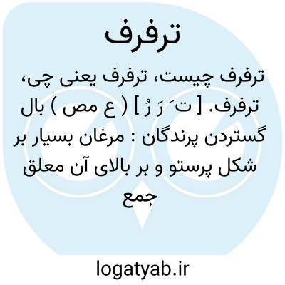 لغت نامه دهخدا ترفرف. [ ت َ رَ رُ ] ( ع مص ) بال گستردن پرندگان: مرغان بسیار بر شکل پرستو و بر بالای آن معلق جمع شوند و محاذی آن همیشه بطیران و ترفرف بر سر آن آب مشغول. ( ترجمه محاسن اصفهان ص 4 ).