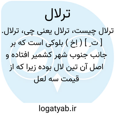 ترلال. [ ت ِ ] ( اِخ ) بلوکی است که بر جانب جنوب شهر کشمیر افتاده و اصل آن تین لال بوده زیرا که از قیمت سه لعل آنجا آباد شده و بلغت کشمیری تین، سه را گویند و لال نام پارسی اصل لعل است و لعل معرب لال است و این لغت از لغت کشمیری و پارسی مرکب شده و این بلوک مشتمل بر چهل پاره قریه و مزرعه خوب و دلگشا است خاصه قریه شیخ زین الدین که مرقد شیخ مذکور مغفور است. ( انجمن آرا ) ( آنندراج ).