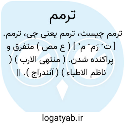 ترمم. [ ت َ رَم ْ م ُ ] ( ع مص ) متفرق و پراکنده شدن. ( منتهی الارب ) ( ناظم الاطباء ) ( آنندراج ). || اصلاح کردن چیزی. ( از اقرب الموارد ) ( از المنجد ). || تعرق. ( اقرب الموارد ) جدا کردن گوشت را از استخوان. ( از المنجد ).