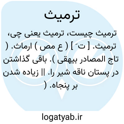 لغت نامه دهخدا ترمیث. [ ت َ ] ( ع مص ) ارماث. ( تاج المصادر بیهقی ). باقی گذاشتن در پستان ناقه شیر را. || زیاده شدن بر پنجاه. ( منتهی الارب ) ( آنندراج ) ( ناظم الاطباء ) ( از اقرب الموارد ). زیاده شدن بر صد. ( از المنجد ).