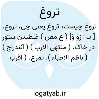 لغت نامه دهخدا تروغ. [ ت َ رَوْ وُ] ( ع مص ) غلطیدن ستور در خاک. ( منتهی الارب ) ( آنندراج ) ( ناظم الاطباء ). تمرغ. ( اقرب الموارد ) ( المنجد ).تروغ. [ ت َ ] ( اِخ ) رجوع به تروق شود.