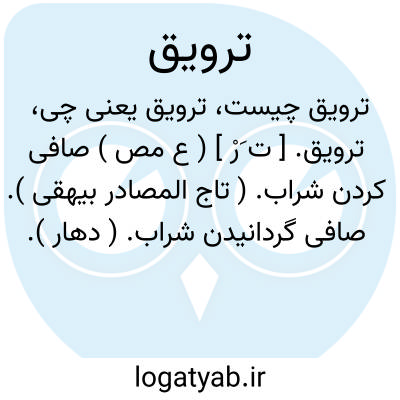 ترویق. [ ت َرْ ] ( ع مص ) صافی کردن شراب. ( تاج المصادر بیهقی ). صافی گردانیدن شراب. ( دهار ). پالودن و روشن و صاف کردن شراب و جز آن. || فروختن چیزی و خریدن بهتر از آن. ( منتهی الارب ) ( آنندراج ) ( ناظم الاطباء ) ( از اقرب الموارد ) ( از المنجد ). || بالا کردن در قیمت چیزی و نخواستن آن را. || فروهشتن شب تاریکی را. || کمیز کردن مست در جامه خود. ( منتهی الارب ) ( آنندراج ) ( ناظم الاطباء ) ( از اقرب الموارد ).