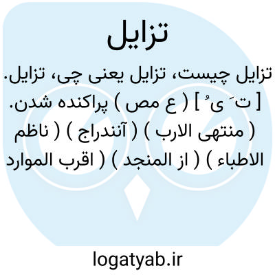 تزایل. [ ت َ ی ُ ] ( ع مص ) پراکنده شدن. ( منتهی الارب ) ( آنندراج ) ( ناظم الاطباء ) ( از المنجد ) ( اقرب الموارد ). || جدایی و جدا شدن. ( منتهی الارب ) ( آنندراج ) ( ناظم الاطباء ) ( از اقرب الموارد ). || شرم داشتن از کسی. ( منتهی الارب ) ( آنندراج ) ( ناظم الاطباء ) ( از متن اللغه ) ( از اقرب الموارد ) ( از المنجد ).