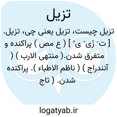 تزیل. [ ت َ زَی ْ ی ُ ] ( ع مص ) پراکنده و متفرق شدن.( منتهی الارب ) ( آنندراج ) ( ناظم الاطباء ). پراکنده شدن. ( تاج المصادر بیهقی ) ( ترجمان جرجانی ترتیب عادل بن علی ). تفرق. ( متن اللغة ) ( اقرب الموارد ) ( المنجد ).